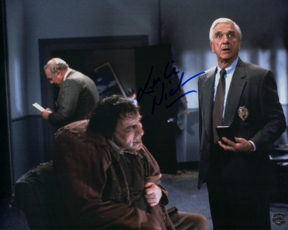 (1926 - 2010) Color 10x8 from the film, Naked Gun 2 1/2, pictured with the hunchback. Signed in blue by Leslie Nielson, in a darker area of the photo, but good contrast.