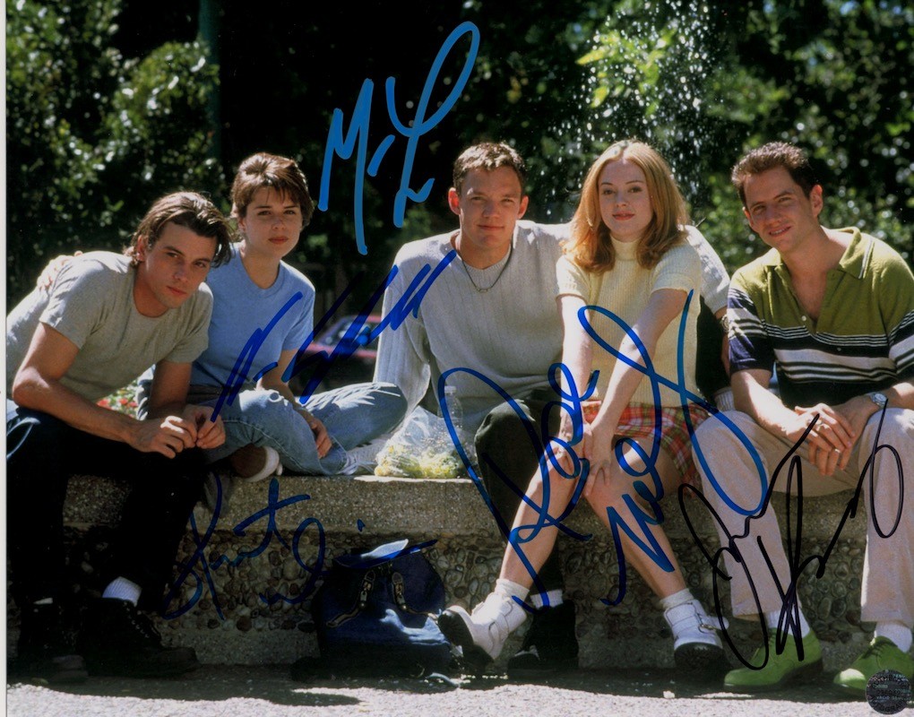 CAST PHOTO - Signed by 5 - Color 10x8 from Wes Craven’s original Scream (1996) signed by the five cast members pictured: Neve Campbell (in blue), Skeet Ulrich (in black), Jamie Kennedy (in black), Matthew Lillard (in blue) and Rose McGowan (boldly in blue). Cheaper than you can get them in person and comes with a COA.